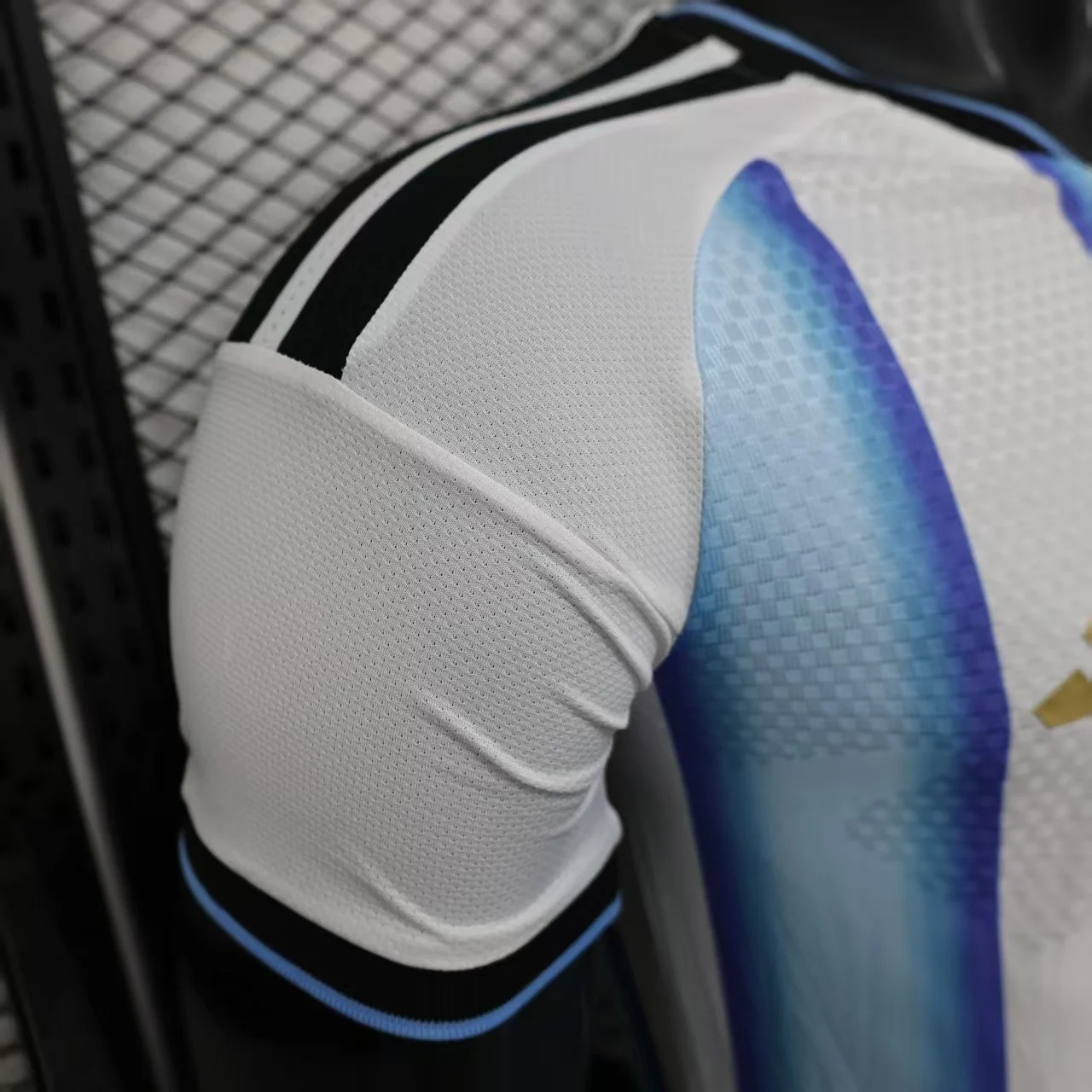 -Composition: 100% Polyester-Predominant Color: White And Blue-Style: For Male-Origin: Thailand-Shield: Silica Gel-Club: Argentina-Sleeve: Short-Collar: V-Neck-Design: Slim fit